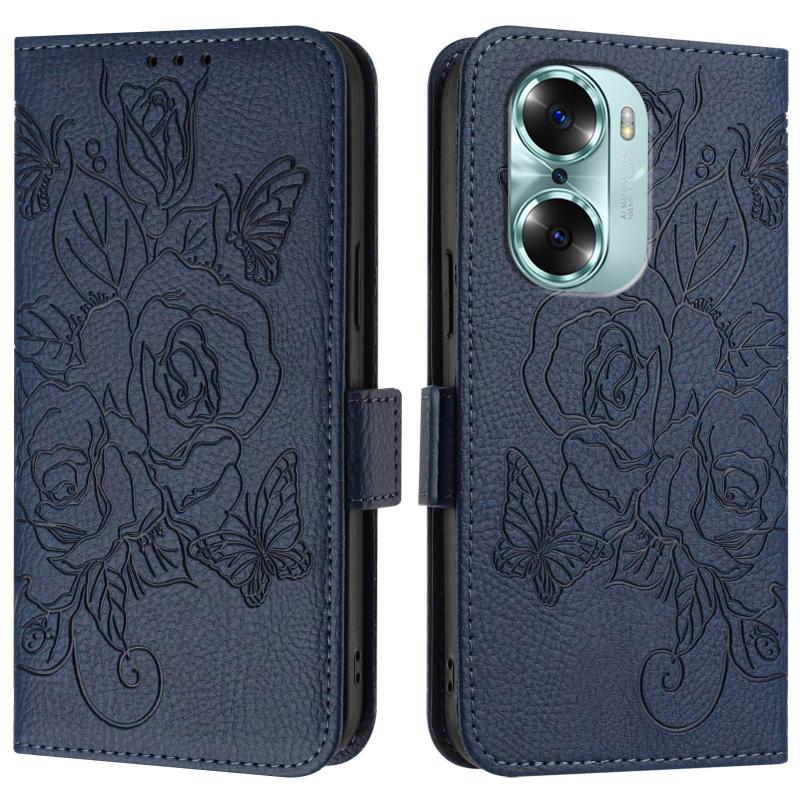 For Honor 60 5G Embossed Rose RFID Anti-theft Leather Phone Case(Dark Blue)