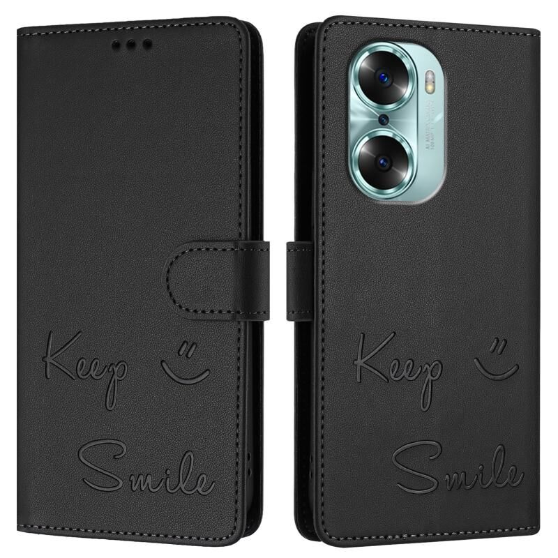 Θήκη τηλεφώνου δερμάτινη με ανάγλυφο χαμόγελο και τεχνολογία RFID για Honor 60 5G (Μαύρο)