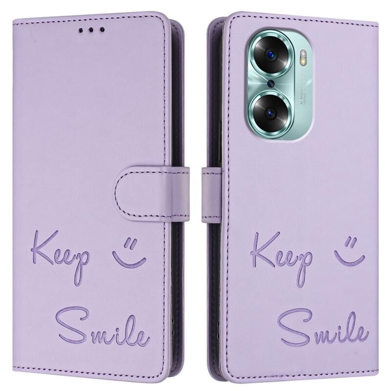 Θήκη τηλεφώνου δερμάτινη με ανάγλυφο χαμόγελο και τεχνολογία RFID για Honor 60 5G (ανοιχτό μωβ)