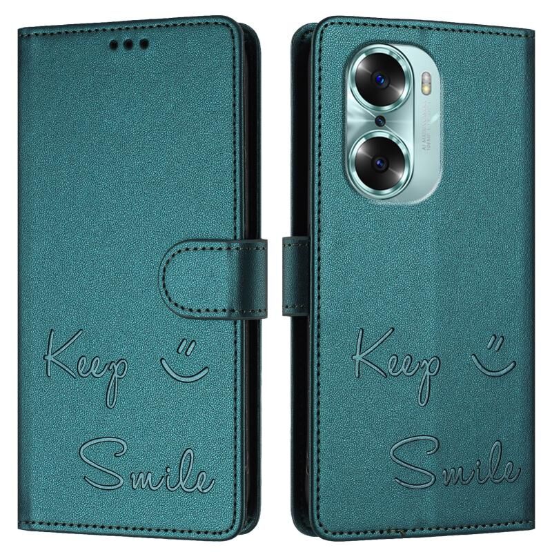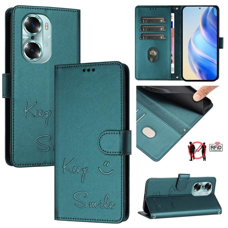 Θήκη τηλεφώνου δερμάτινη με ανάγλυφο χαμόγελο και τεχνολογία RFID για Honor 60 5G (Πράσινο παγωνιού)