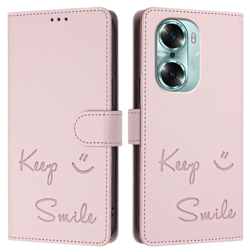 Θήκη τηλεφώνου δερμάτινη με ανάγλυφο χαμόγελο και τεχνολογία RFID για Honor 60 5G (ρόζ)