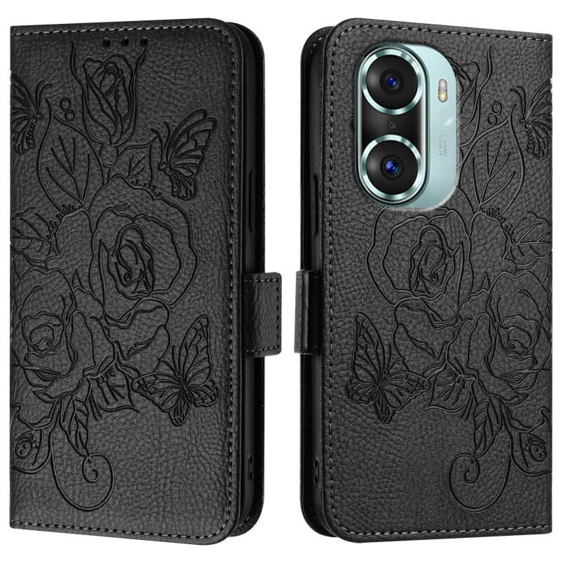 For Honor 60 Pro 5G Embossed Rose RFID Anti-theft Leather Phone Case(Black)