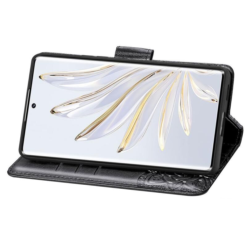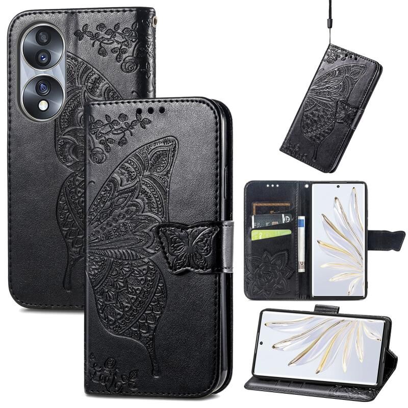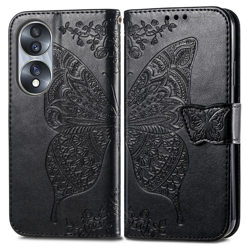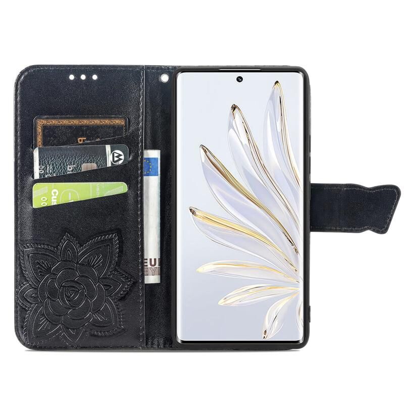 Θήκη τηλεφώνου από δέρμα με οριζόντιο άνοιγμα, ανάγλυφη με σχέδιο πεταλούδας και λουλουδιών για Honor 70 (Μαύρο)