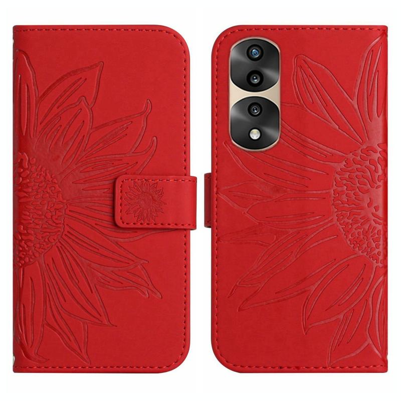 Θήκη τηλεφώνου από δέρμα με σχέδιο ηλίανθου και αίσθηση δέρματος για Honor 70 Pro+, με λουρί (Κόκκινο)