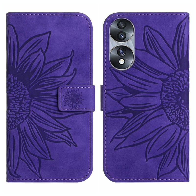 Θήκη τηλεφώνου από δέρμα με σχέδιο ηλίανθου και λουρί για Honor 70 (Μωβ σκούρο)