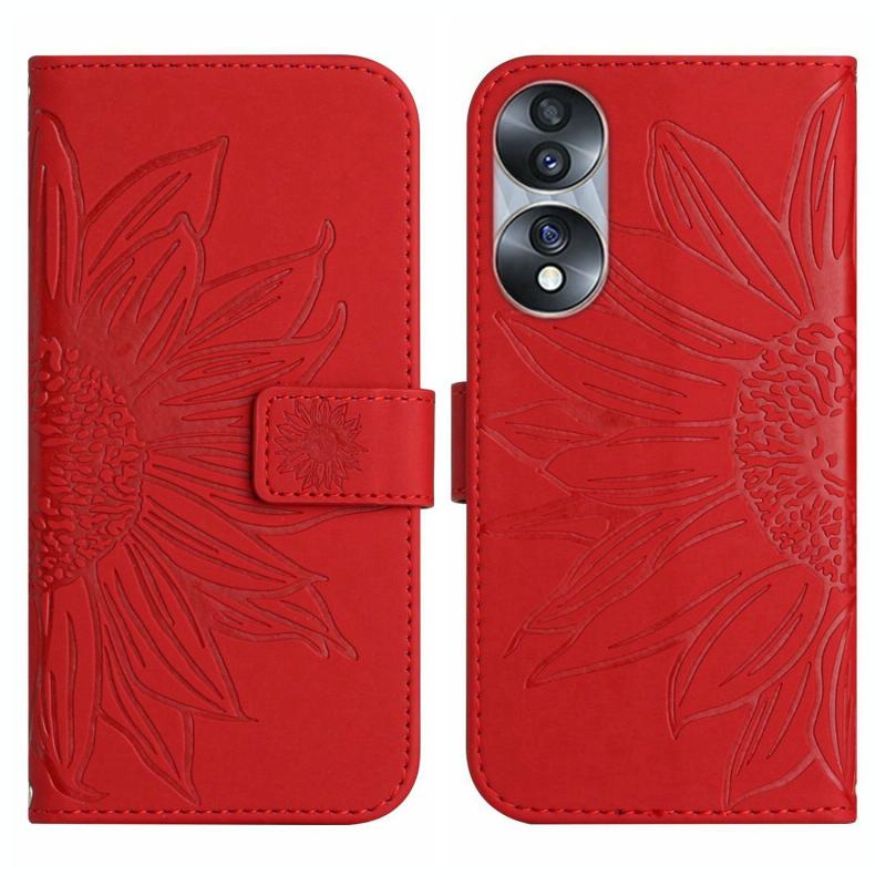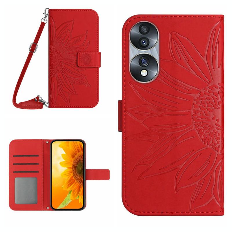Θήκη τηλεφώνου από δέρμα με σχέδιο ηλίανθου και λουρί για Honor 70 (Κόκκινο κρασί)