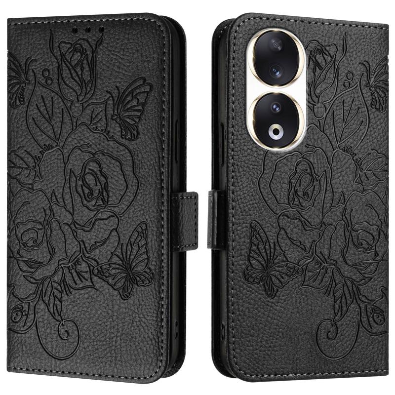 For Honor 90 5G Embossed Rose RFID Anti-theft Leather Phone Case(Black)