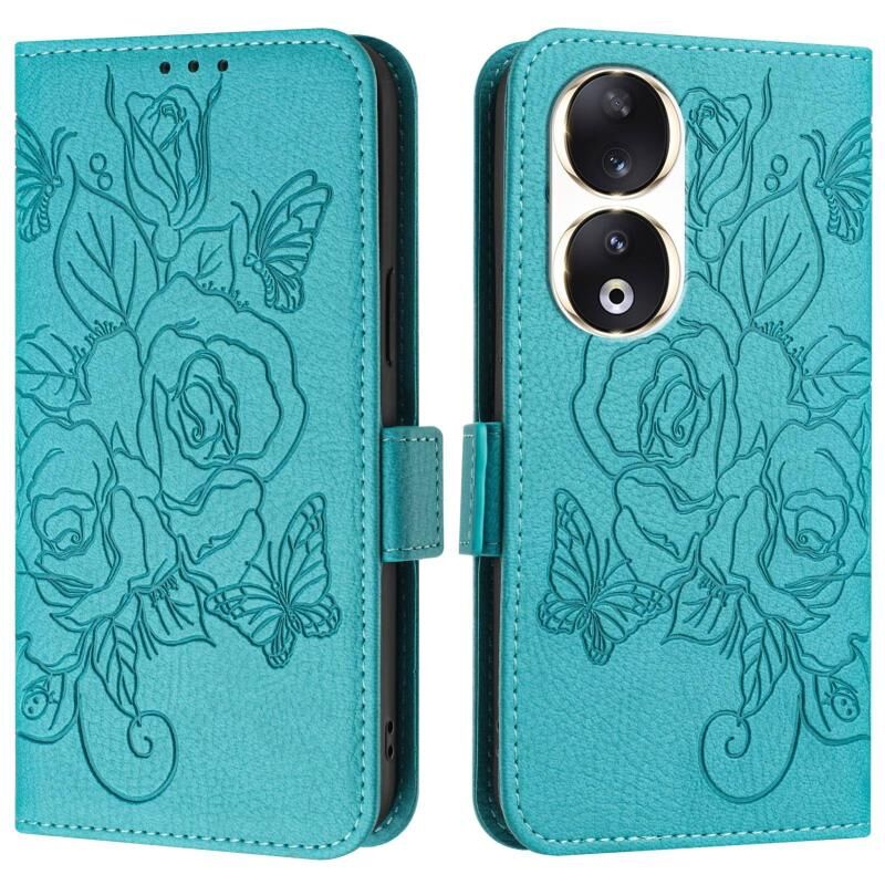 Θήκη τηλεφώνου δερμάτινη με ανάγλυφο σχέδιο τριαντάφυλλου και προστασία RFID κατά της κλοπής για Honor 90 5G (Ανοιχτό μπλε)