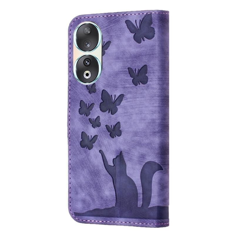 Θήκη τηλεφώνου από δέρμα με ανάγλυφο σχέδιο πεταλούδας και γάτας για Honor 90 / 80 (Μωβ)
