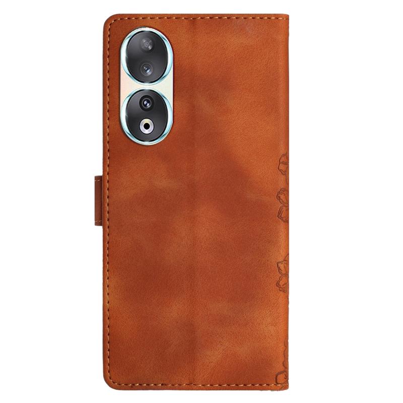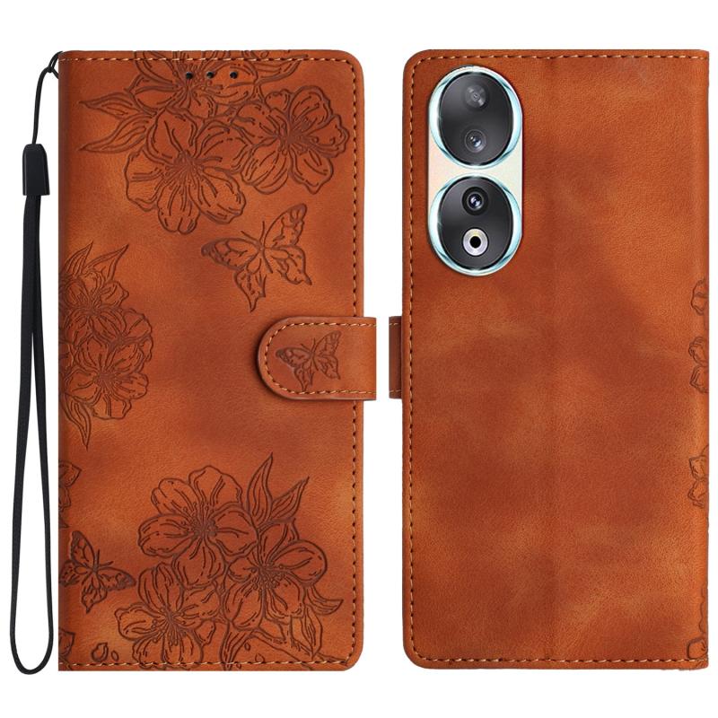 For Honor 90 Cherry Blossom Butterfly Skin Feel Embossed PU Phone Case(Brown)
