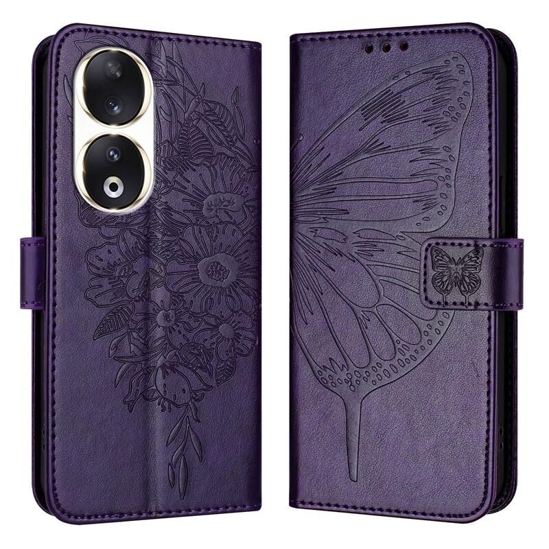 Για Honor 90 ανάγλυφη πεταλούδα δερμάτινη θήκη τηλεφώνου (Dark Purple)