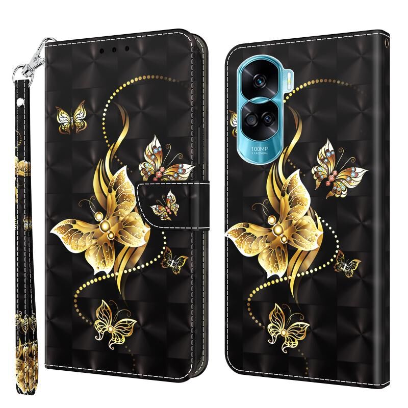 Θήκη τηλεφώνου από δέρμα με τρισδιάστατη βαφή για Honor 90 Lite (Χρυσή Πεταλούδα Γλάρου)