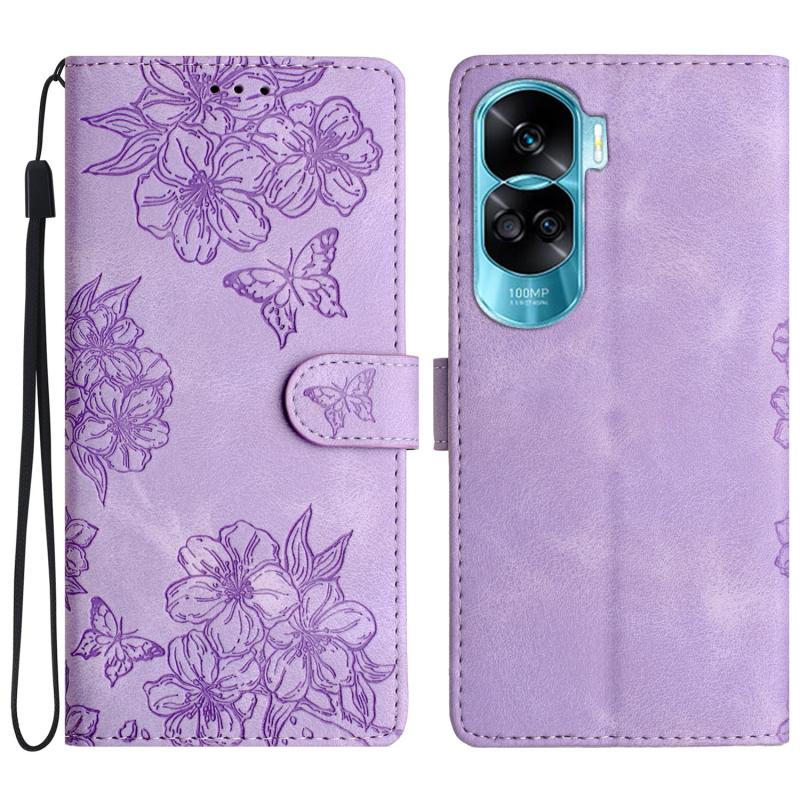 For Honor 90 Lite 5G Cherry Blossom Butterfly Skin Feel Embossed PU Phone Case(Purple)