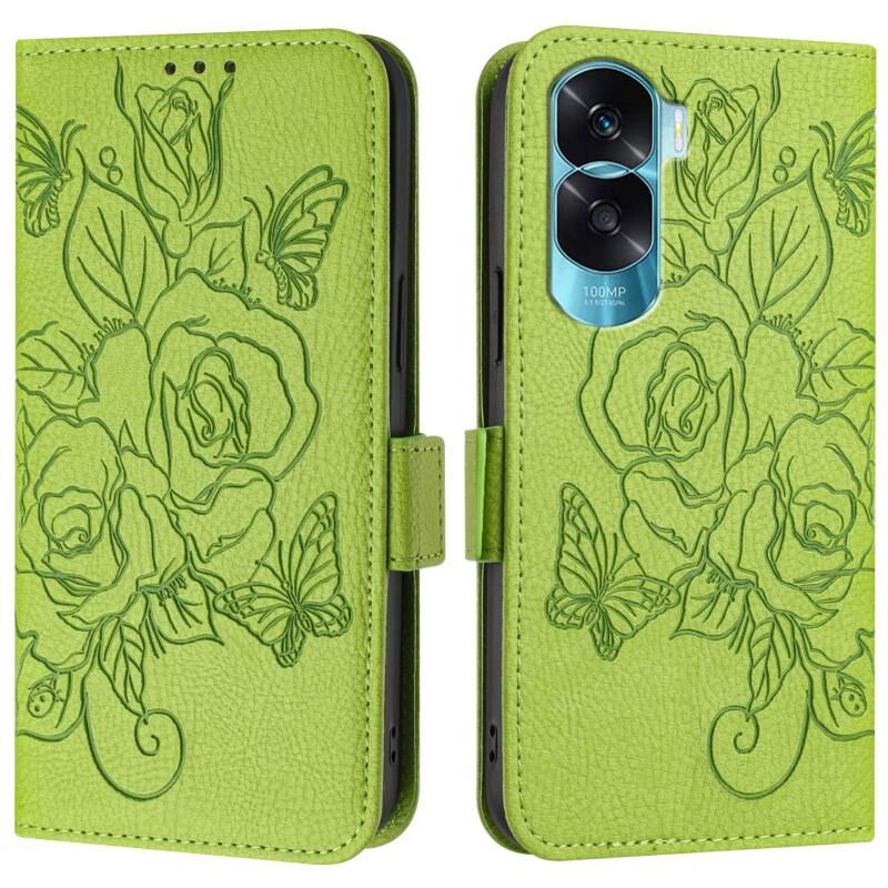 Θήκη τηλεφώνου από δέρμα με ανάγλυφο σχέδιο τριαντάφυλλου και προστασία RFID κατά της κλοπής για Honor 90 Lite 5G / X50i 5G (Πράσινο)