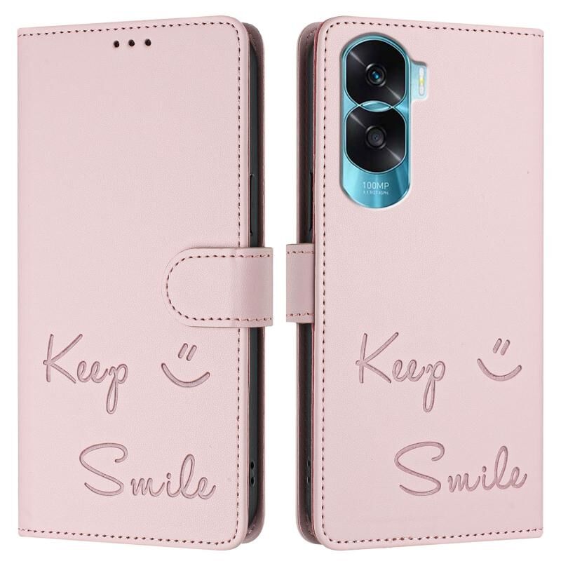 Θήκη τηλεφώνου από δέρμα με ανάγλυφο χαμόγελο RFID για Honor 90 Lite 5G/X50i 5G (Μέντας Πράσινο)