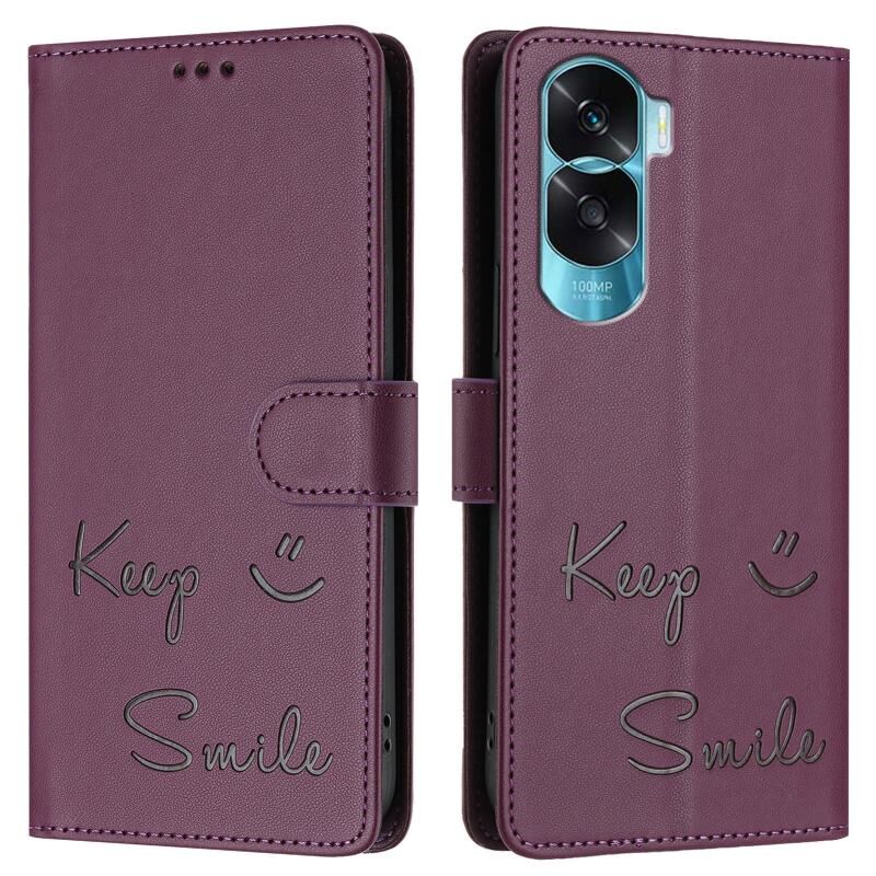 Θήκη τηλεφώνου από δέρμα με ανάγλυφο χαμόγελο και προστασία RFID για Honor 90 Lite 5G/X50i 5G (Μωβ)
