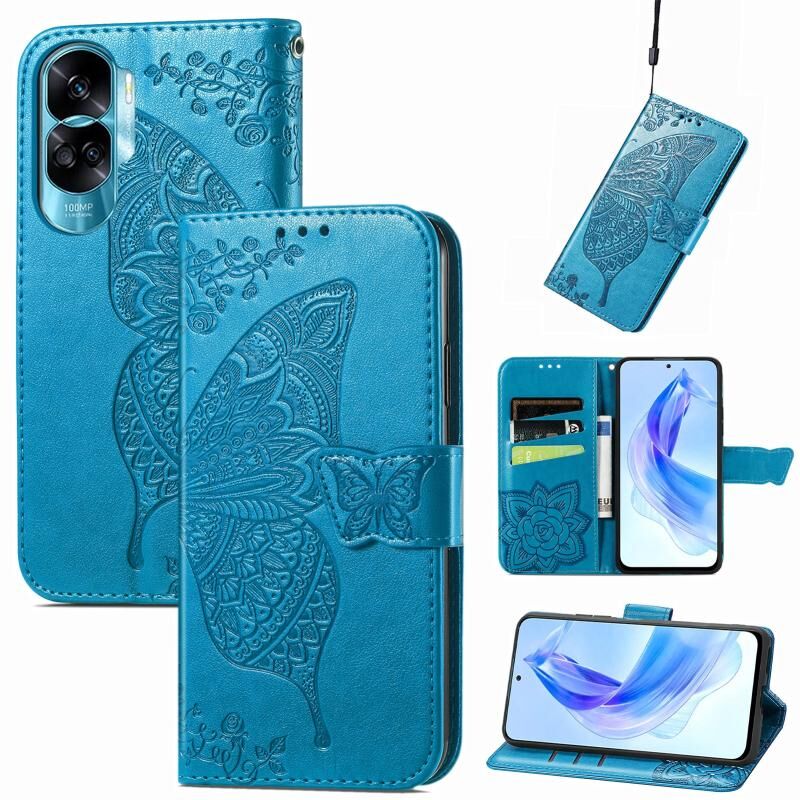 Θήκη τηλεφώνου δερμάτινη ανάγλυφη με σχέδιο πεταλούδας και λουλουδιών για Honor 90 Lite (Μπλε)