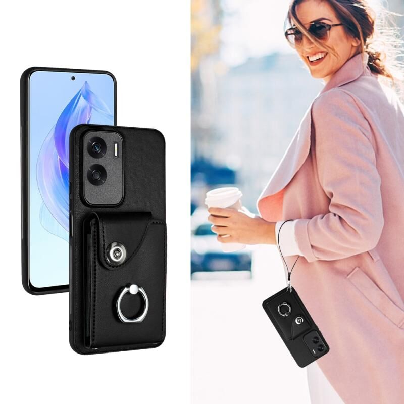 Για Honor 90 Lite / X50i Οργανική κάρτα τσάντα δαχτυλίδι κάτοχος PU υπόθεση τηλεφώνου με κορδόνι (μαύρο)