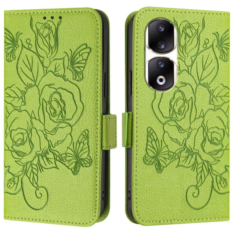 Θήκη τηλεφώνου δερμάτινη με ανάγλυφο σχέδιο τριαντάφυλλου και προστασία RFID κατά της κλοπής για Honor 90 Pro 5G (Πράσινο)