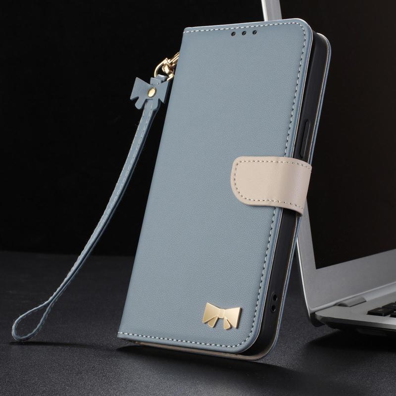 For Honor 90 Pro 5G Metal Bow Leather Phone Case with Hand Strap(Light Blue)
