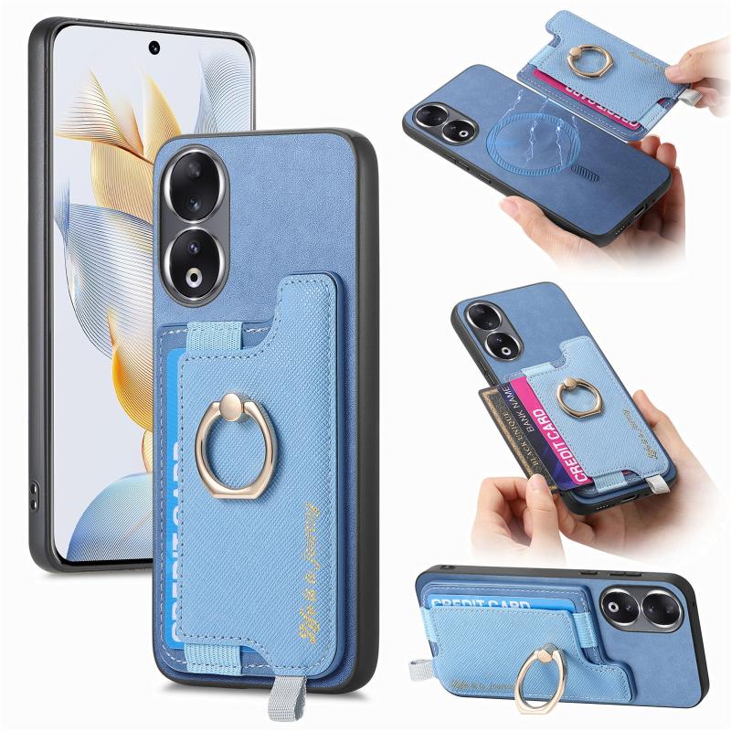 For Honor 90 Pro 5G Retro Magsafe Cross Leather Ring Holder Card Bag Phone Case(Blue)