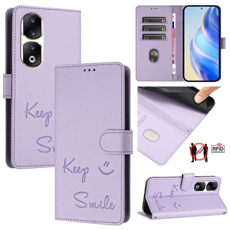 Θήκη τηλεφώνου δερμάτινη με ανάγλυφο χαμόγελο και τεχνολογία RFID για Honor 90 Pro 5G (ανοιχτό μωβ)