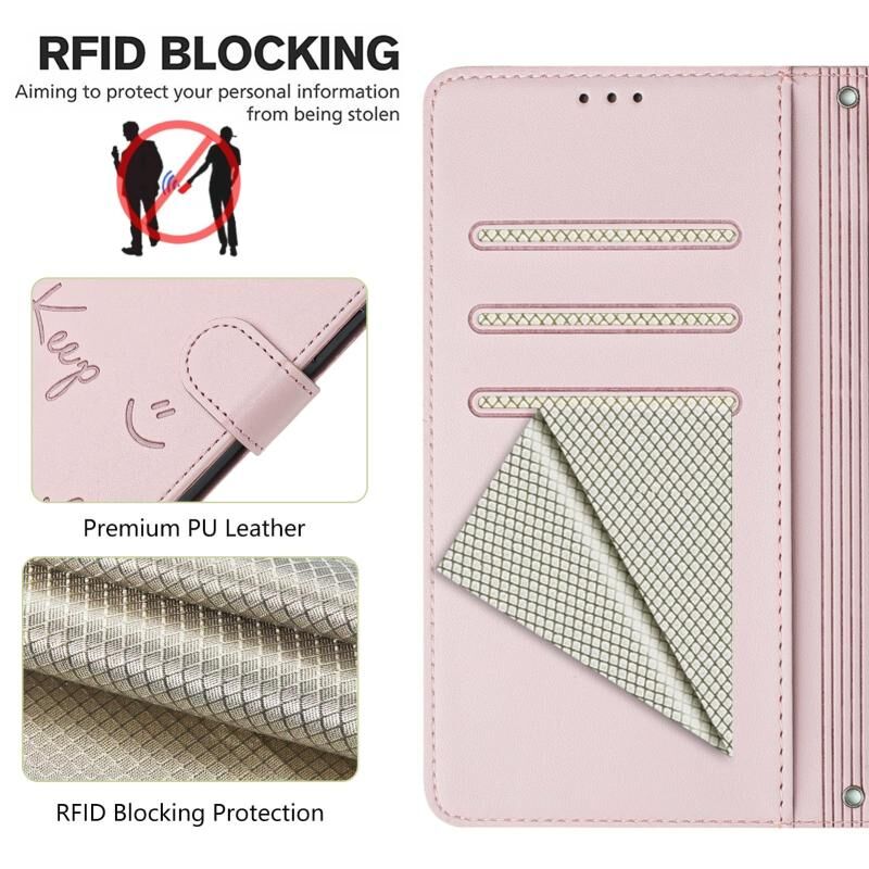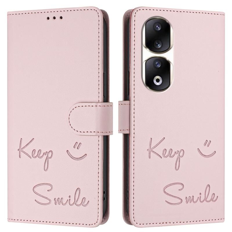 Θήκη τηλεφώνου δερμάτινη με ανάγλυφο χαμόγελο και τεχνολογία RFID για Honor 90 Pro 5G (ρόζ)