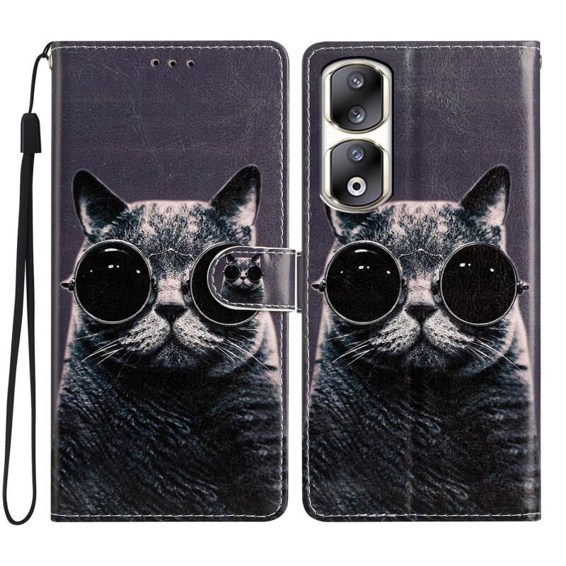 Θήκη τηλεφώνου από δέρμα με έγχρωμη σχεδίαση για Honor 90 Pro (Γάτα με γυαλιά ηλίου)
