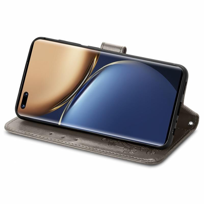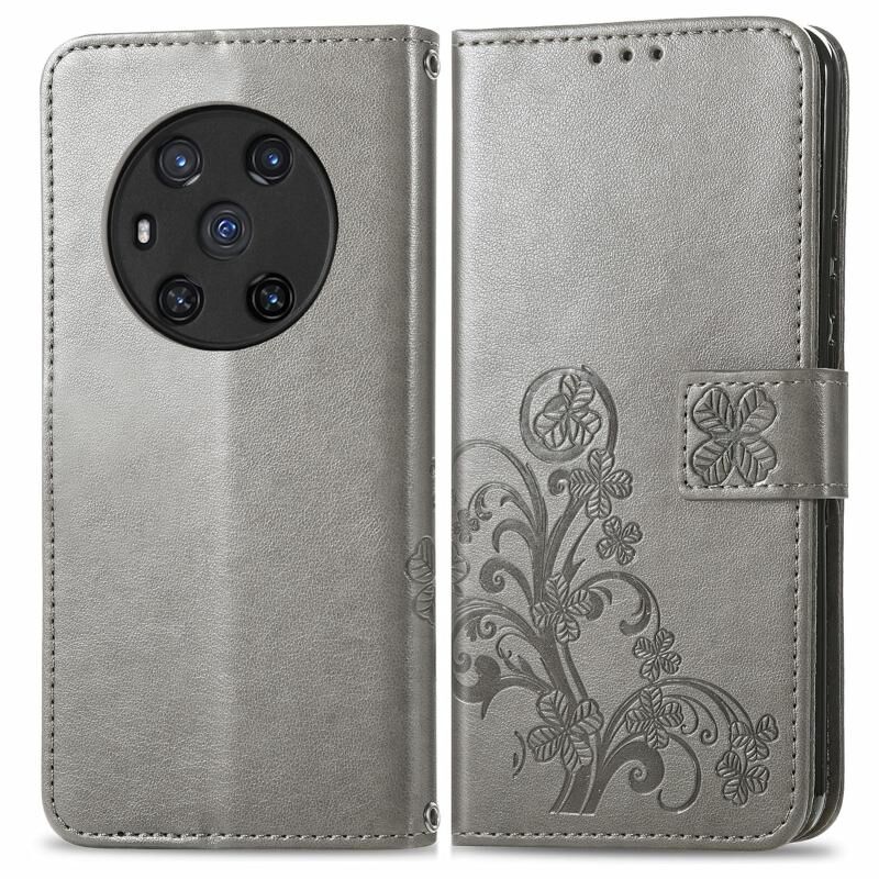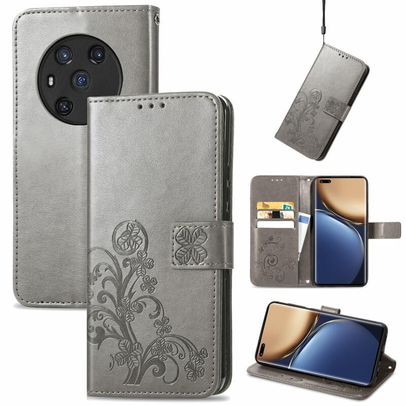 Για Honor Magic3 Τέσσερα φύλλα κούμπωμα ανάγλυφο αγκράφα δερμάτινη θήκη τηλεφώνου (γκρι)