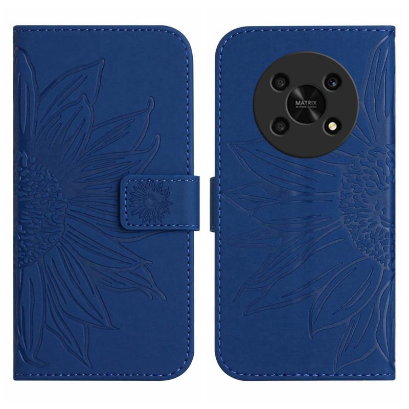Θήκη τηλεφώνου από δέρμα με σχέδιο ηλίανθου και αίσθηση μαγείας για Honor Magic4 Lite 5G, τύπου flip με κορδόνι (Σκούρο μπλε)