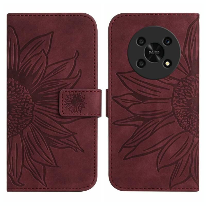 Θήκη τηλεφώνου από δέρμα με σχέδιο ηλίανθου και αίσθηση μαγείας για Honor Magic4 Lite 5G, τύπου flip με κορδόνι (Κρασοκόκκινο)