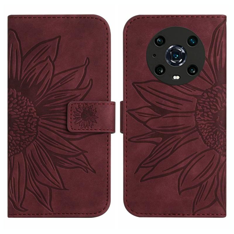 Θήκη τηλεφώνου από δέρμα με σχέδιο ηλίανθου και λουρί για Honor Magic4 Pro, με αίσθηση απαλότητας (Κόκκινο Ρόδι)