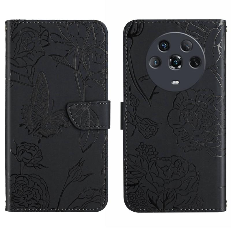 For Honor Magic4 Skin Feel Butterfly Peony Embossed Leather Phone Case(Black)