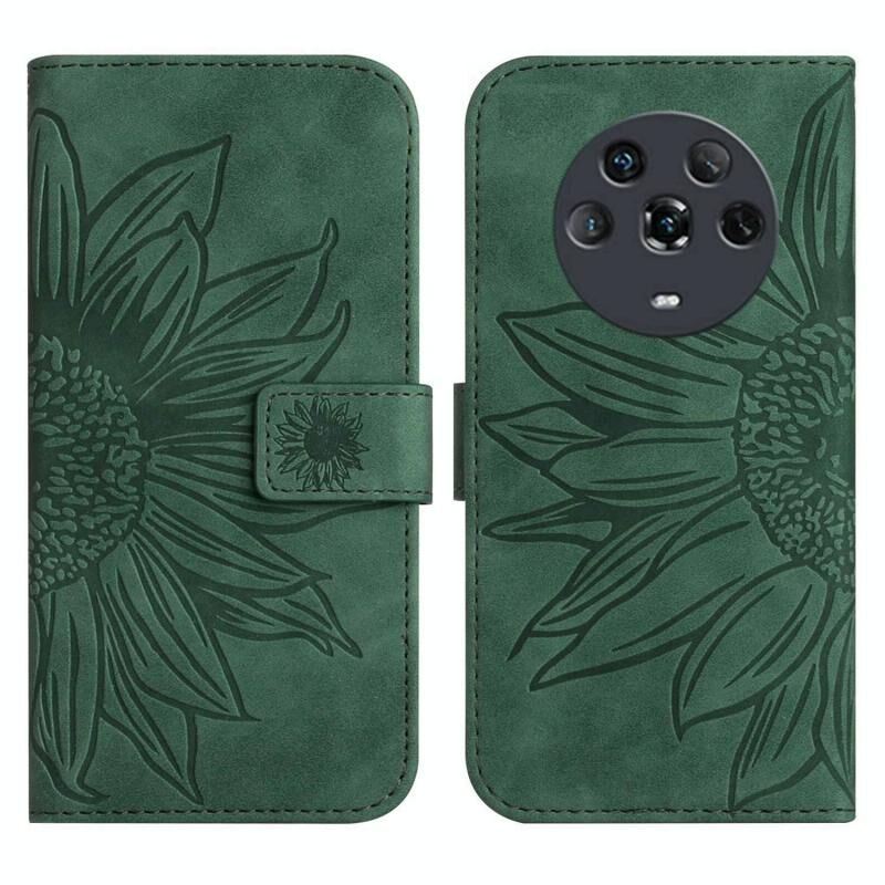 Για Honor Magic4 Skin Feel Sun Flower μοτίβο Flip δέρμα τηλέφωνο υπόθεση με κορδόνι (πράσινο)