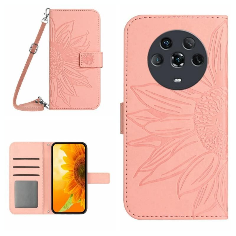 Για Honor Magic4 Skin Feel Sun Flower μοτίβο Flip δέρμα τηλέφωνο υπόθεση με κορδόνι (ροζ)
