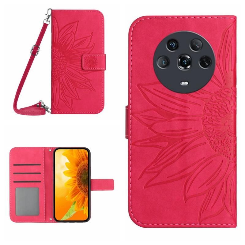 Για Honor Magic4 Skin Feel Sun Flower μοτίβο Flip δέρμα τηλέφωνο υπόθεση με κορδόνι (Rose Red)