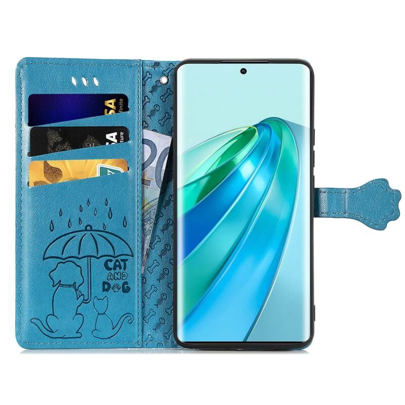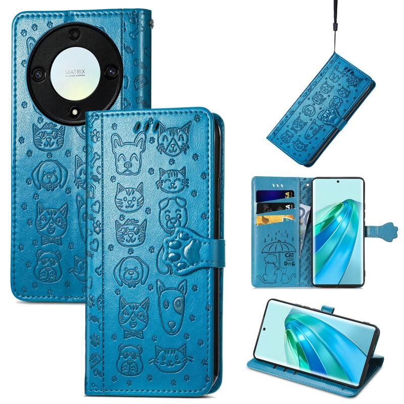 Θήκη τηλεφώνου από δέρμα με ανάγλυφα σχέδια χαριτωμένων γάτας και σκύλου για Honor Magic5 Lite (Μωβ)