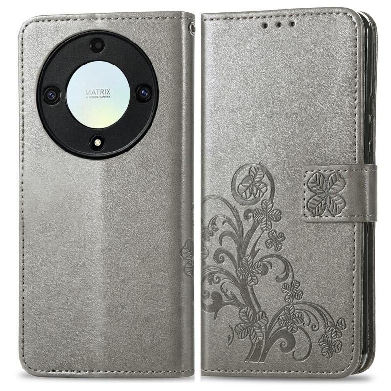 Για Honor Magic5 Lite Τέσσερα φύλλα κούμπωμα ανάγλυφο πόρπη δερμάτινη θήκη τηλεφώνου (Γκρι)