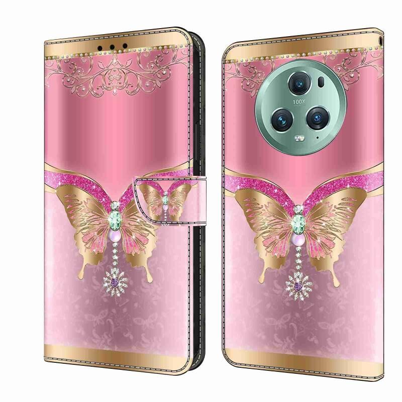 Θήκη κινητού τηλεφώνου από δέρμα, αντικραδασμική, προστατευτική, κρυστάλλινη 3D για Honor Magic5 Pro (Ροζ πεταλούδα στο κάτω μέρος)