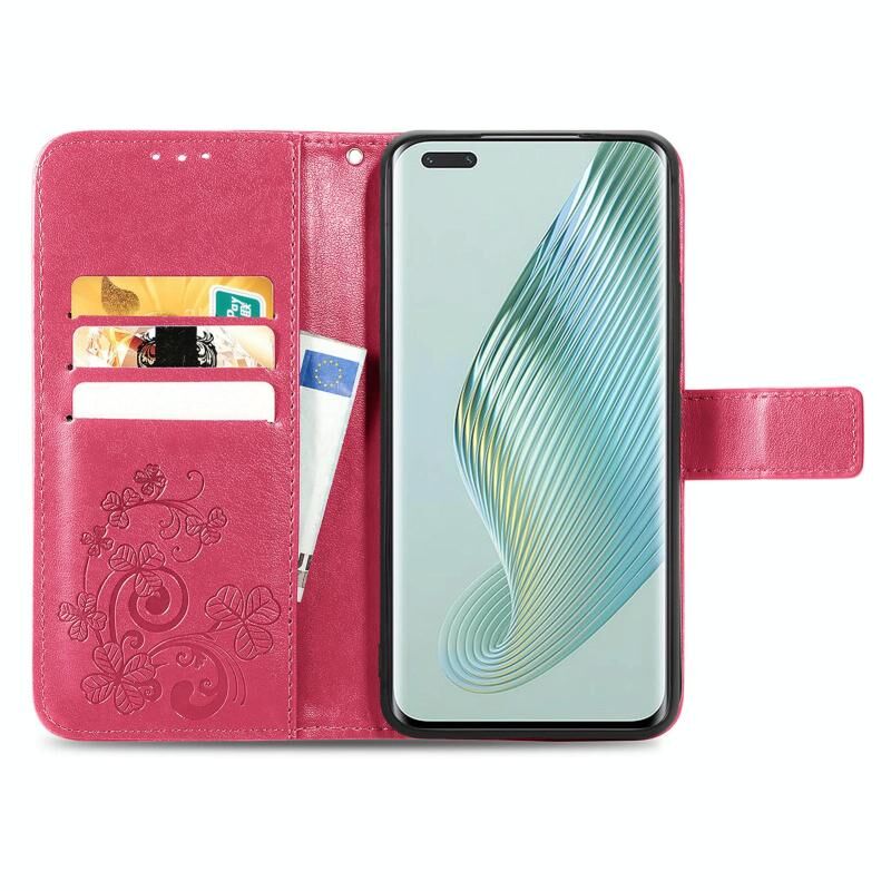 Για Honor Magic5 Pro Τέσσερα φύλλα κούμπωμα ανάγλυφο πόρπη δερμάτινη θήκη τηλεφώνου (Rose)