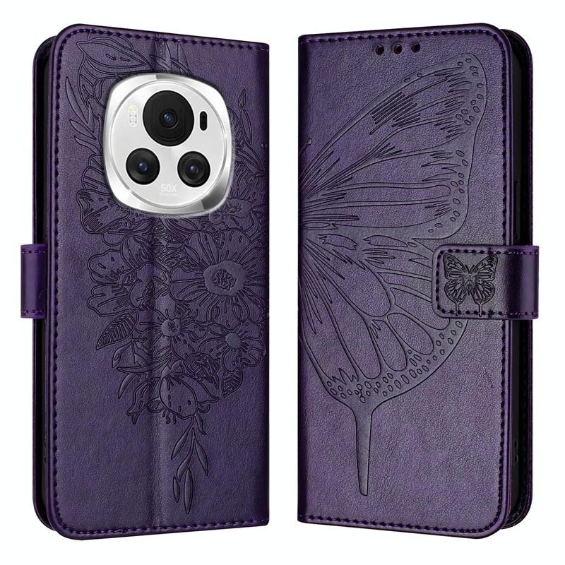 Για Honor Magic6 5G Παγκόσμια ανάγλυφη πεταλούδα δερμάτινη θήκη τηλεφώνου (Σκούρο μωβ)