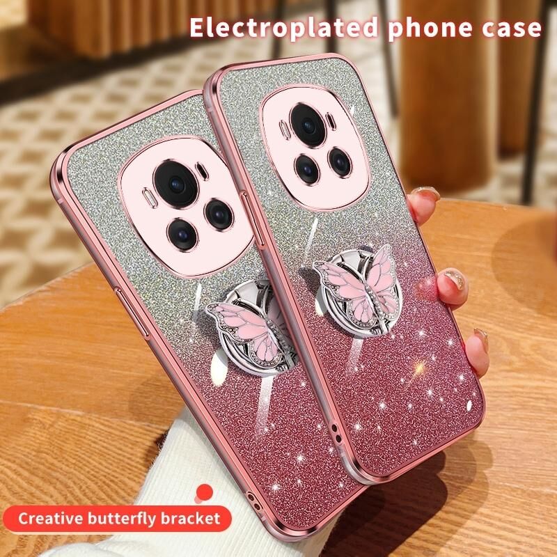 Θήκη κινητού τηλεφώνου TPU με σχέδιο πεταλούδας από γκλίτερ με διαβαθμισμένο χρώμα για Honor Magic6 (Ροζ)