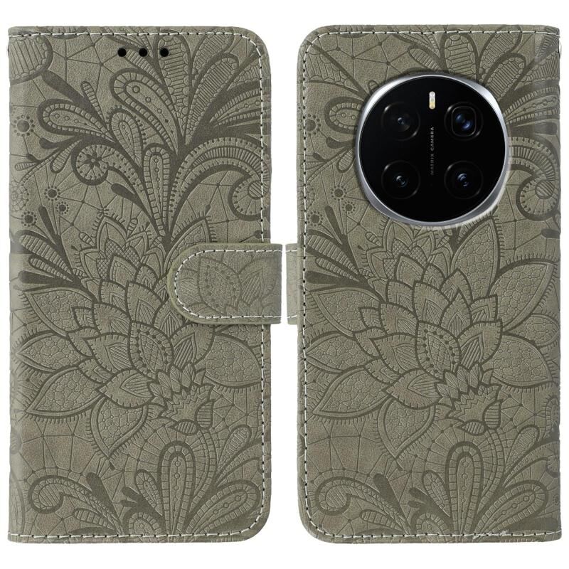 Θήκη τηλεφώνου δερμάτινη, τύπου flip, με δαντέλα και ανάγλυφο σχέδιο λουλουδιών για Honor Magic7 Pro (Γκρι)