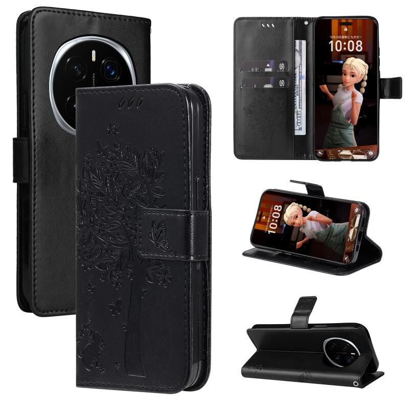 Θήκη τηλεφώνου δερμάτινη, τύπου flip, με ανάγλυφο σχέδιο δέντρου & γάτας για Honor Magic7 Pro (Ροζ)