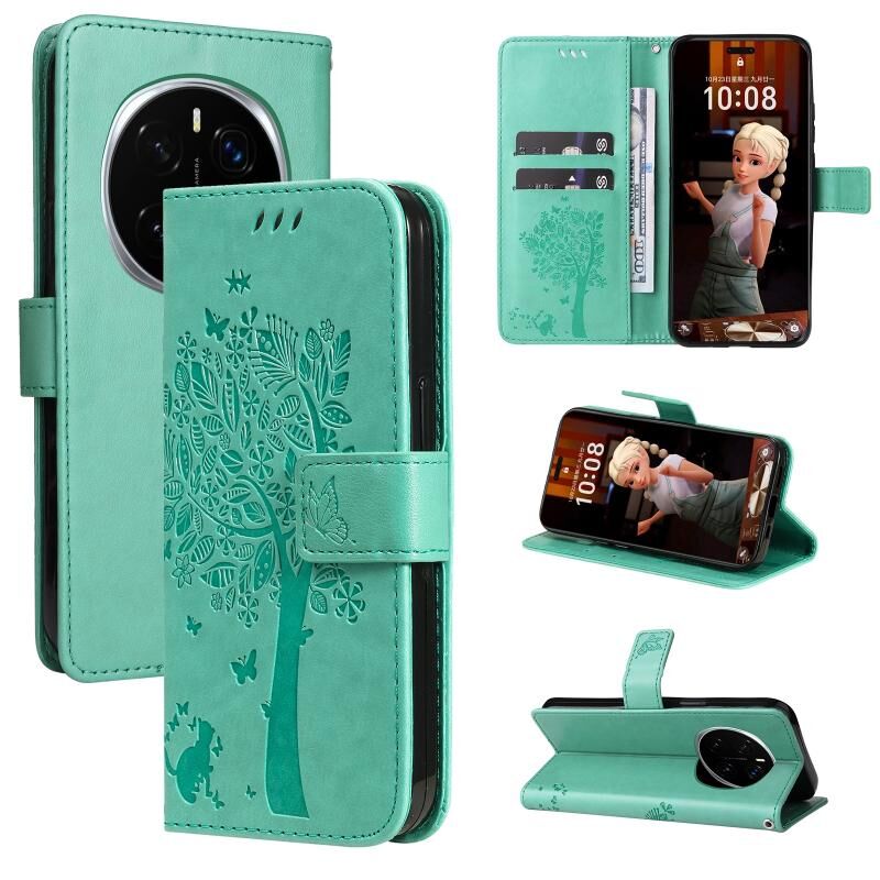 Θήκη τηλεφώνου δερμάτινη, τύπου flip, με ανάγλυφο σχέδιο δέντρου & γάτας για Honor Magic7 Pro (Ροζ)