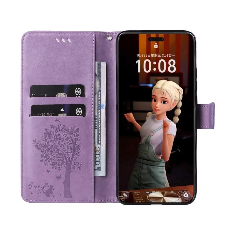Θήκη τηλεφώνου δερμάτινη, τύπου flip, με ανάγλυφο σχέδιο δέντρου & γάτας για Honor Magic7 Pro (Ροζ)