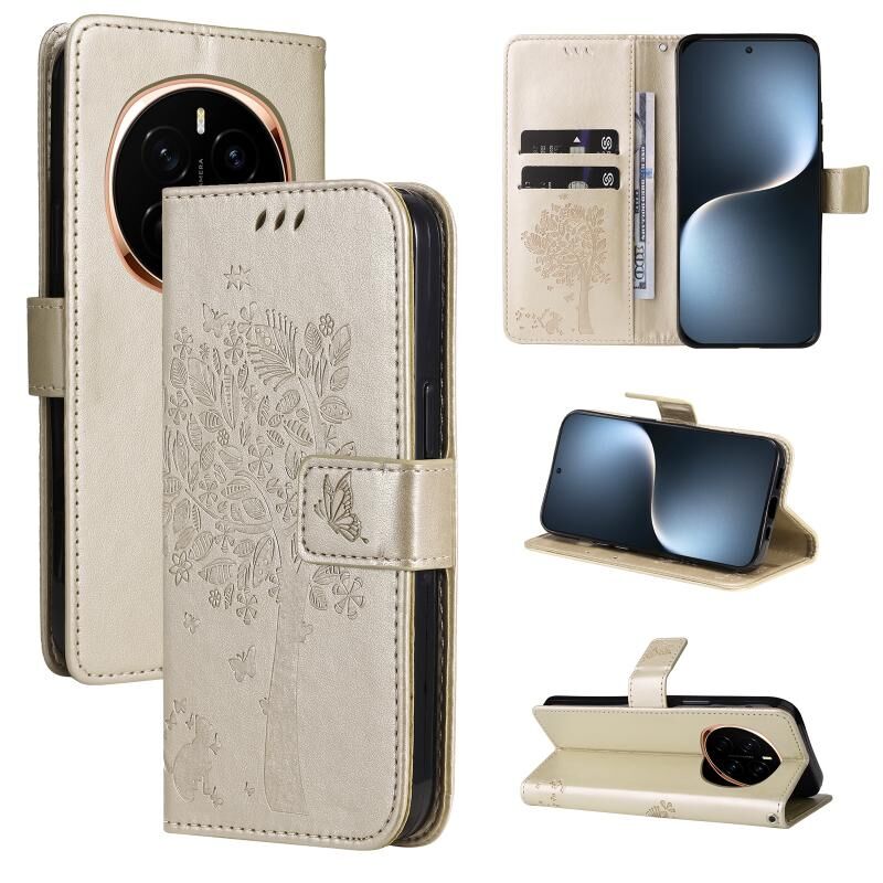 Θήκη τηλεφώνου από δέρμα με σχέδιο ανάγλυφου δέντρου & γάτας For Honor Magic7 (Ροζ)