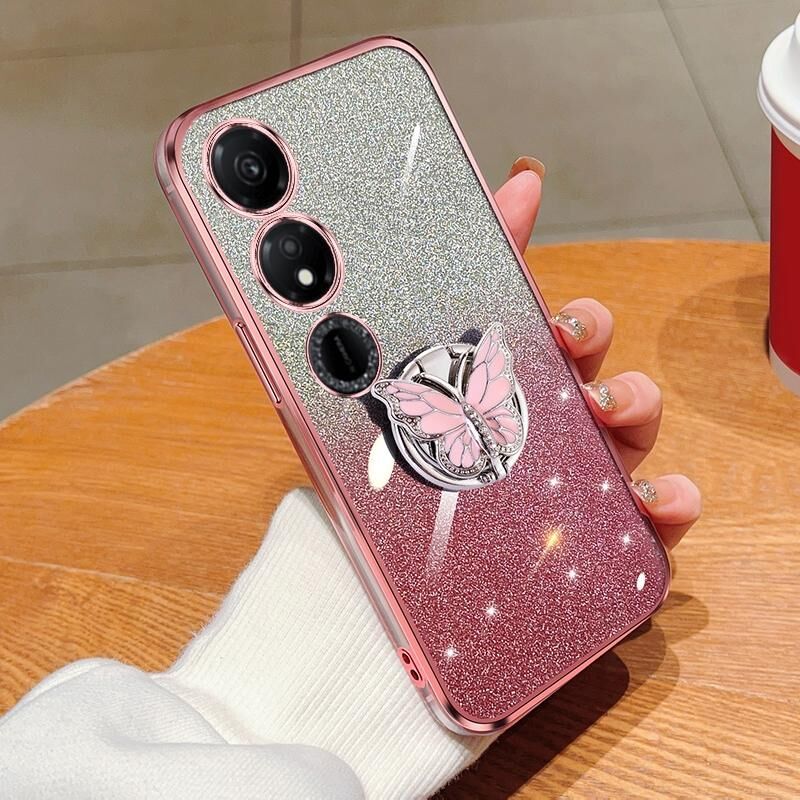 Θήκη κινητού τηλεφώνου TPU για Honor Play 40, με επιμετάλλωση, διαβαθμιστικό γκλίτερ και σχέδιο πεταλούδας (Ροζ)