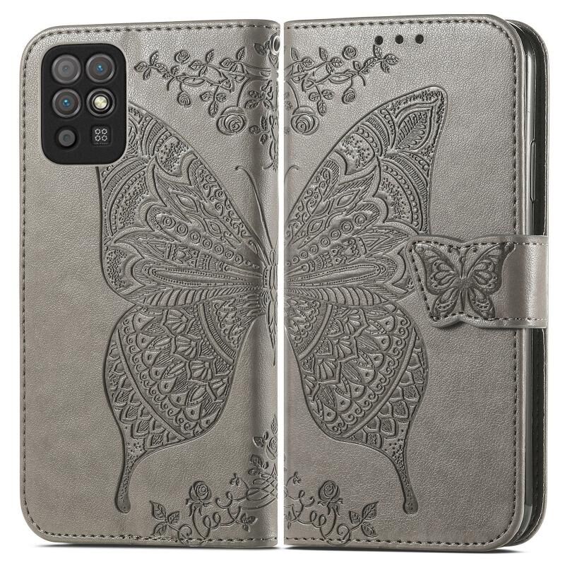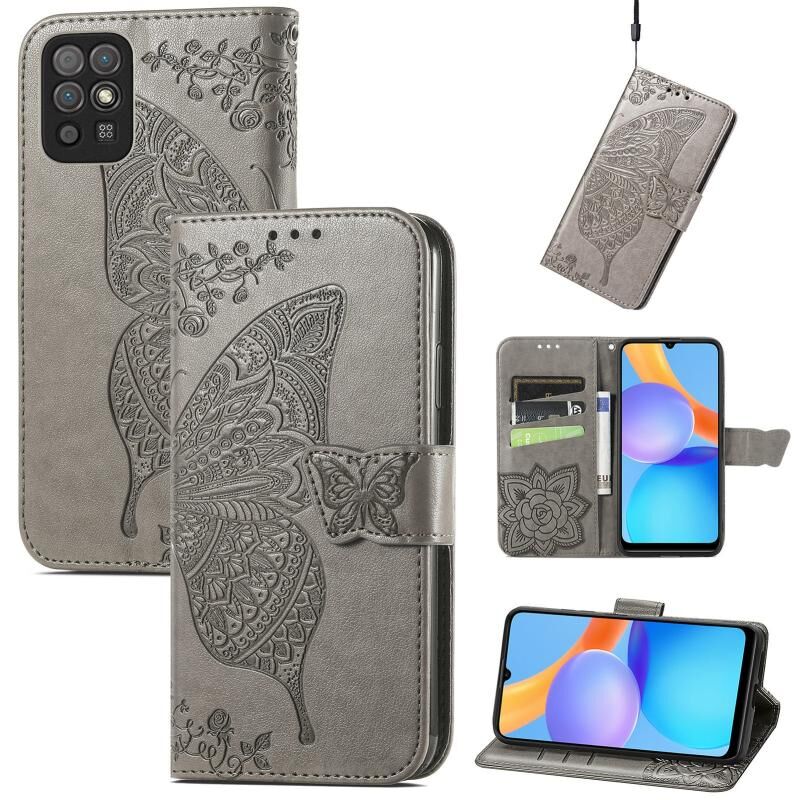 Για Honor Play 5T Νεολαία πεταλούδα αγάπη λουλούδια ανάγλυφο οριζόντια Flip δερμάτινη θήκη με κάτοχο & υποδοχές για κάρτες & πορτοφόλι & κορδόνι (γκρι)