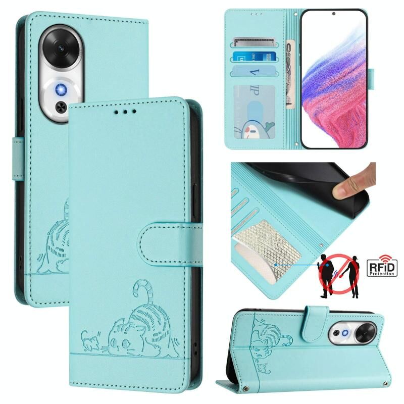 Θήκη τηλεφώνου από δέρμα με ανάγλυφο σχέδιο γάτας και κουνελιού για Honor Play 60 5G, με προστασία RFID και λουρί (Μέντας Πράσινο)